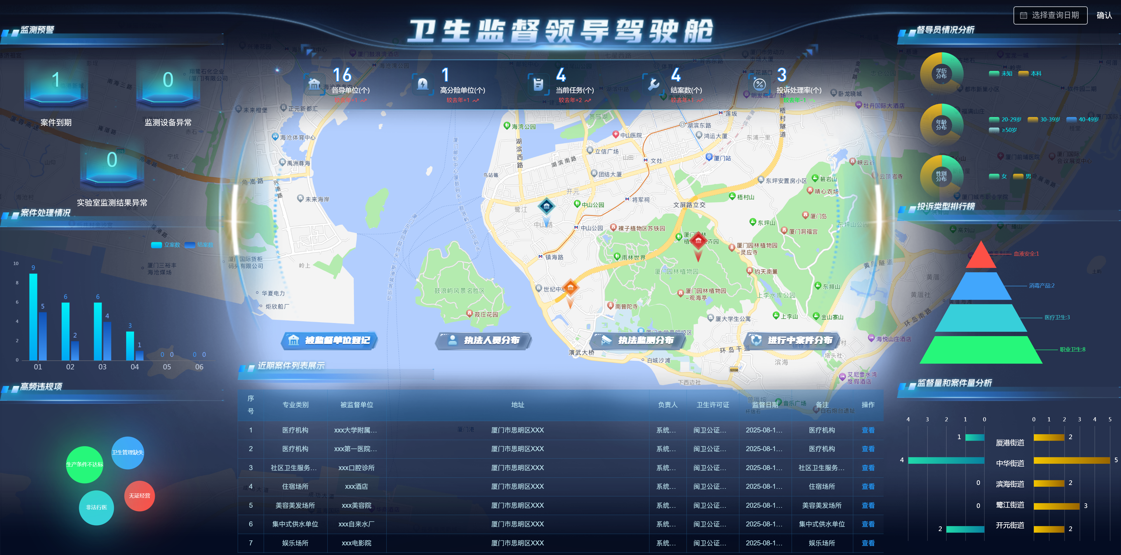 “智慧衛(wèi)監(jiān)綜合監(jiān)管服務(wù)管理系統(tǒng)”涵蓋監(jiān)督執(zhí)法應(yīng)用、非現(xiàn)場執(zhí)法應(yīng)用、碼上監(jiān)管、可視化駕駛艙、信息交換系統(tǒng)等內(nèi)容,實現(xiàn)加強衛(wèi)生監(jiān)督綜合執(zhí)法能力建設(shè),依法推進衛(wèi)生監(jiān)督工作,不斷創(chuàng)新衛(wèi)生監(jiān)督執(zhí)法手段,提高衛(wèi)生監(jiān)督的監(jiān)管和應(yīng)急處置水平,通過建設(shè)智慧衛(wèi)監(jiān)系統(tǒng),將傳統(tǒng)現(xiàn)場監(jiān)管與非現(xiàn)場物聯(lián)網(wǎng)智能監(jiān)督監(jiān)測手段相結(jié)合,解決目前衛(wèi)生監(jiān)督機構(gòu)無法及時掌握和處置突發(fā)狀況的問題,做到在第一時間獲取現(xiàn)場數(shù)據(jù),在事件發(fā)生、升級前提前預(yù)警和處置,提高執(zhí)法效率。